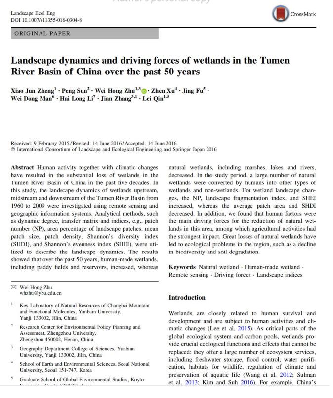 20.《Landscape dynamics and driving forces of wetlands in the Tumen River Basin of China over the past 50 years》
