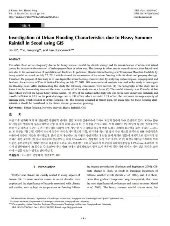30.《Investigation of Urban Flooding Characteristics due to Heavy Summer Rainfall in Seoul using GIS》