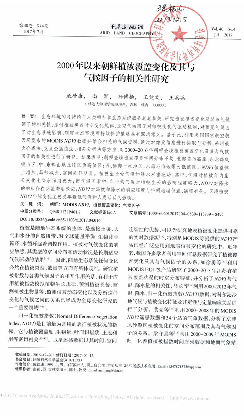 54.《2000年以来朝鲜植被覆盖变化及其与气候因子的相关性研究》