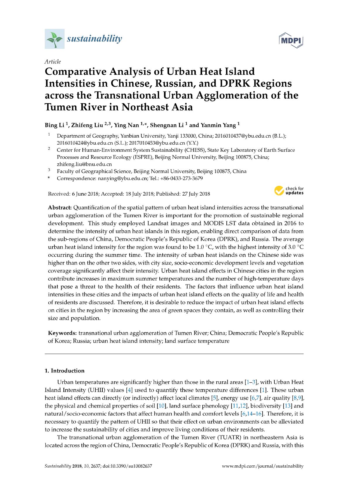17.《Comparative Analysis of Urban Heat Island Intensities in Chinese, Russian, and DPRK Regions across the Transnational Urban Agglomeration of the Tumen River in Northeast Asia》